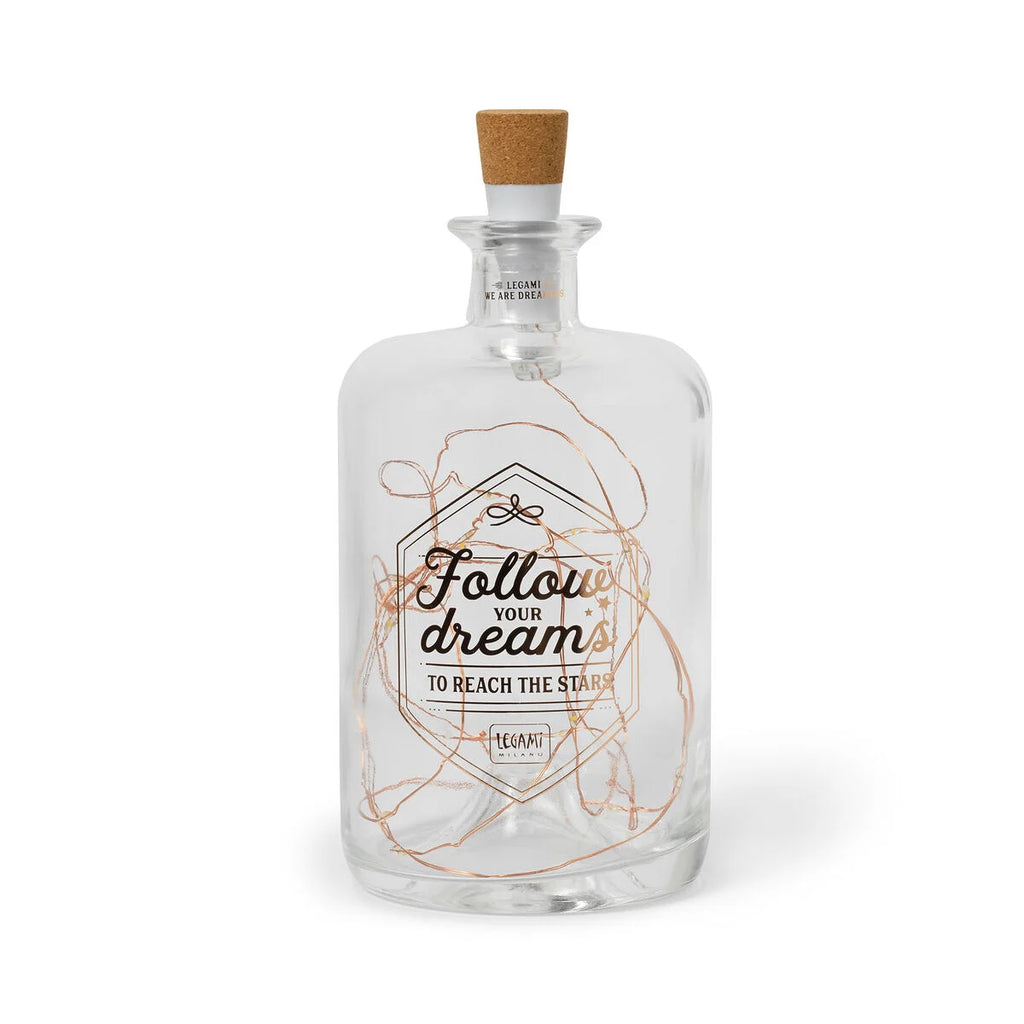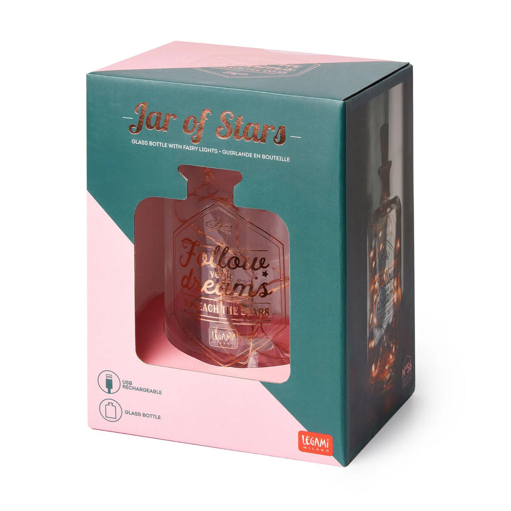 Follow your dreams with the Legami Jar of Stars - Glass Bottle with LED Lights. Consisting of 20 LED lights strung onto a copper wire and housed in a clear glass bottle with cap, reaching for the stars is closer than you first thought.